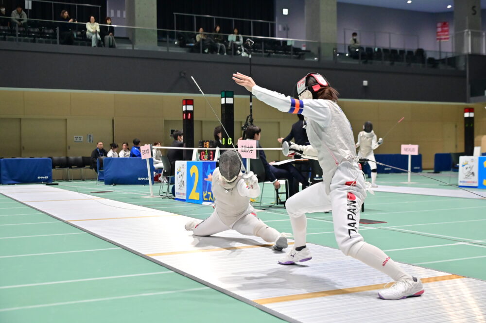 大会初日に行われた同フルーレ団体は2回戦から出場。準々決勝では24年の全日本学生王座決定戦で敗れた早大と対戦。2セット目まで1失点に抑え10―1と好調なスタートを切ると、4セット目の竹山夏芽(スポーツ科1=京都・乙訓高)と8セット目の中出陽愛(同4=岐阜・羽島北高)が5点を先取して大きく突き放し、45―14で圧勝した。